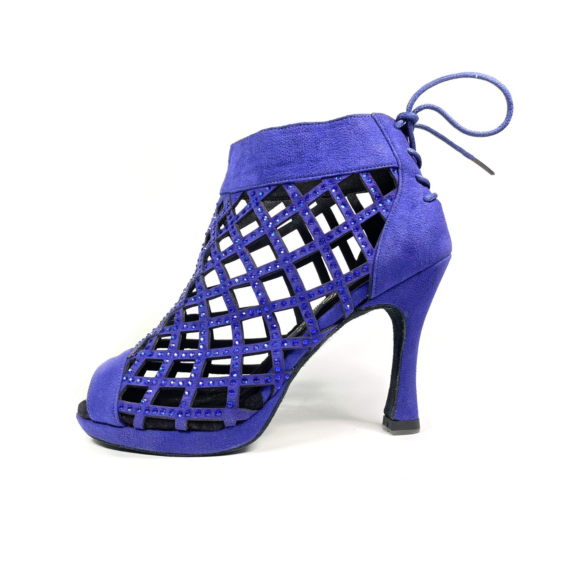 Bootie style Latin dance shoe, with suede sole and platform with microfiber insole for maximum comfort. Decorated with hotfix rhinestones and a blue mesh strip pattern. In this type of dance shoe (boot), we recommend that from size 37 onwards, you wear one size larger.
