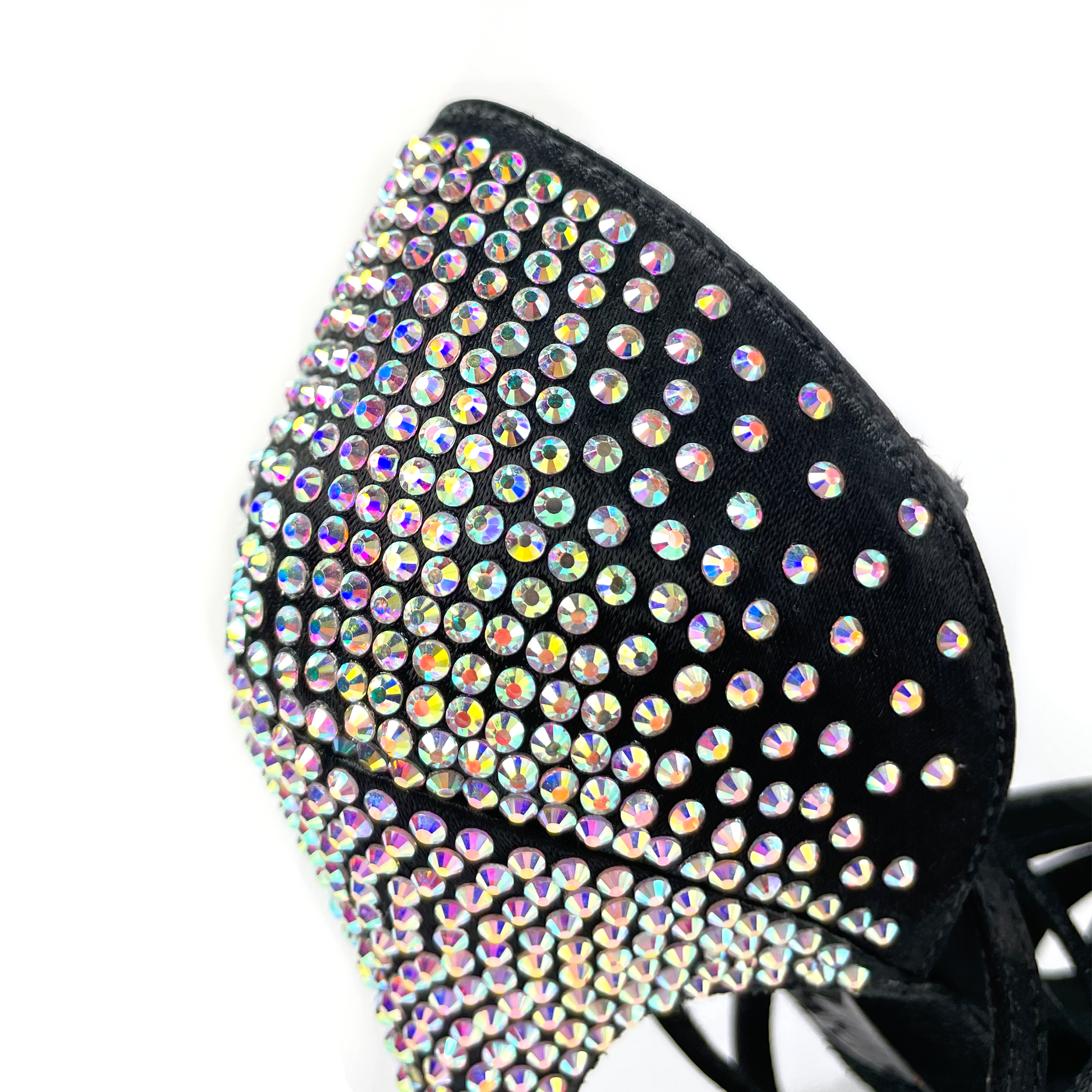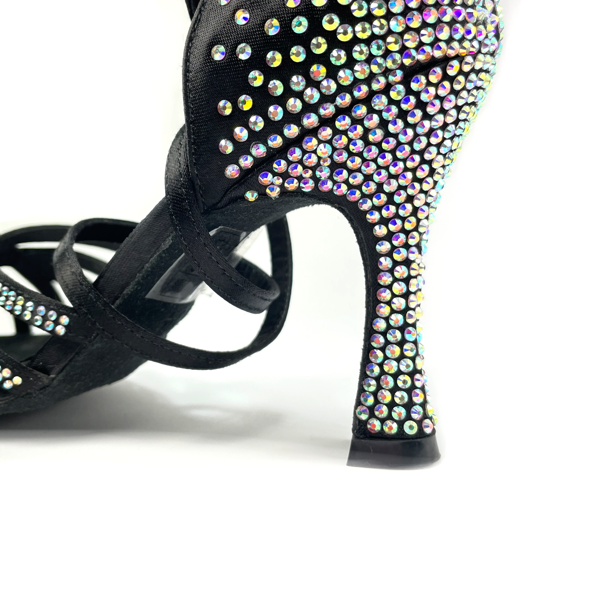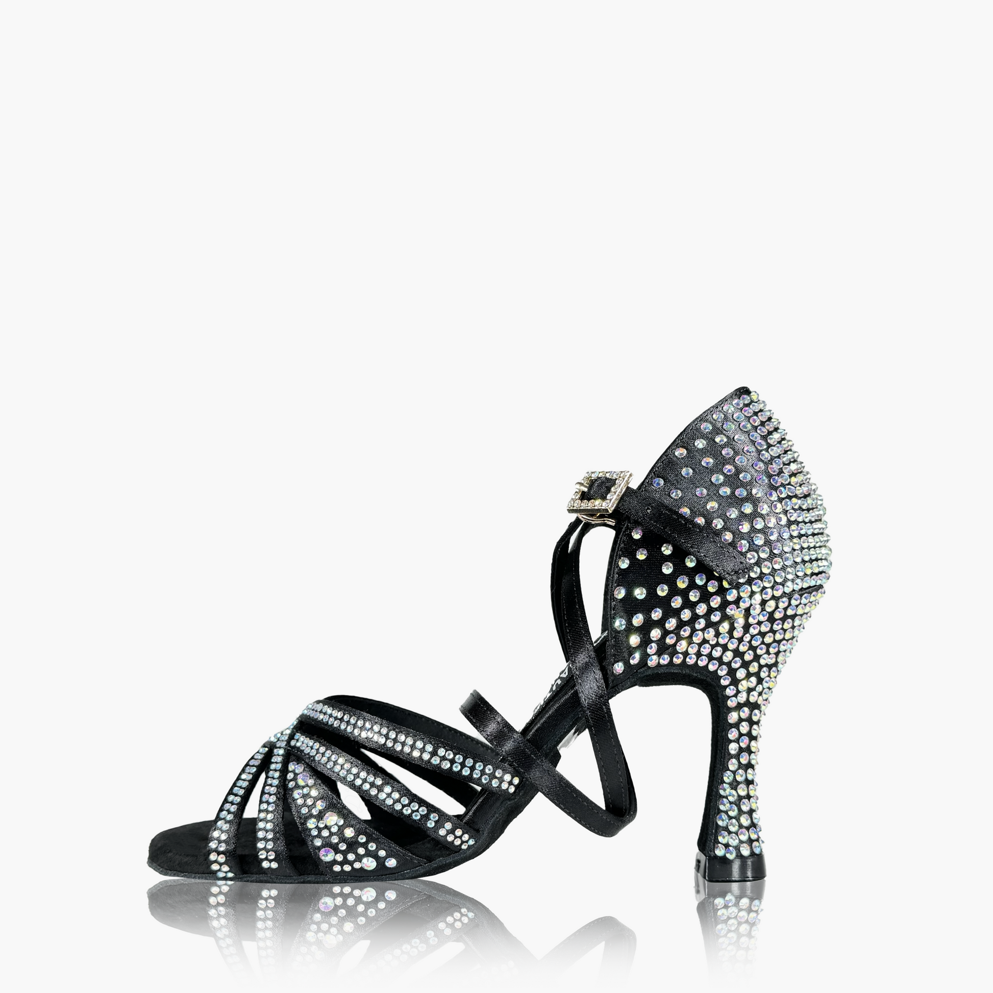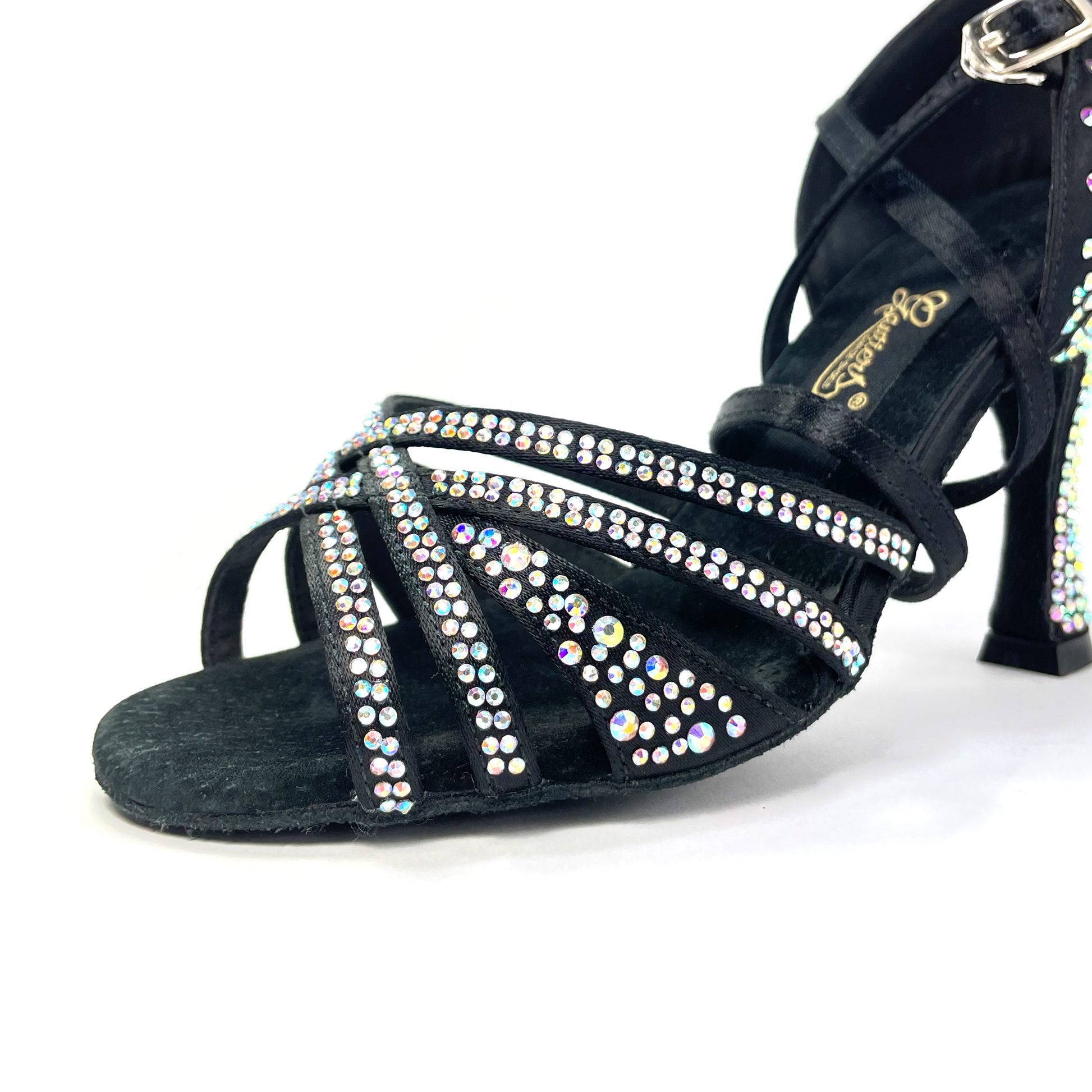 Latin dance shoe with suede sole and microfiber insole for maximum comfort. Designed with a style of horizontal strips decorated with hotfix rhinestones in black.