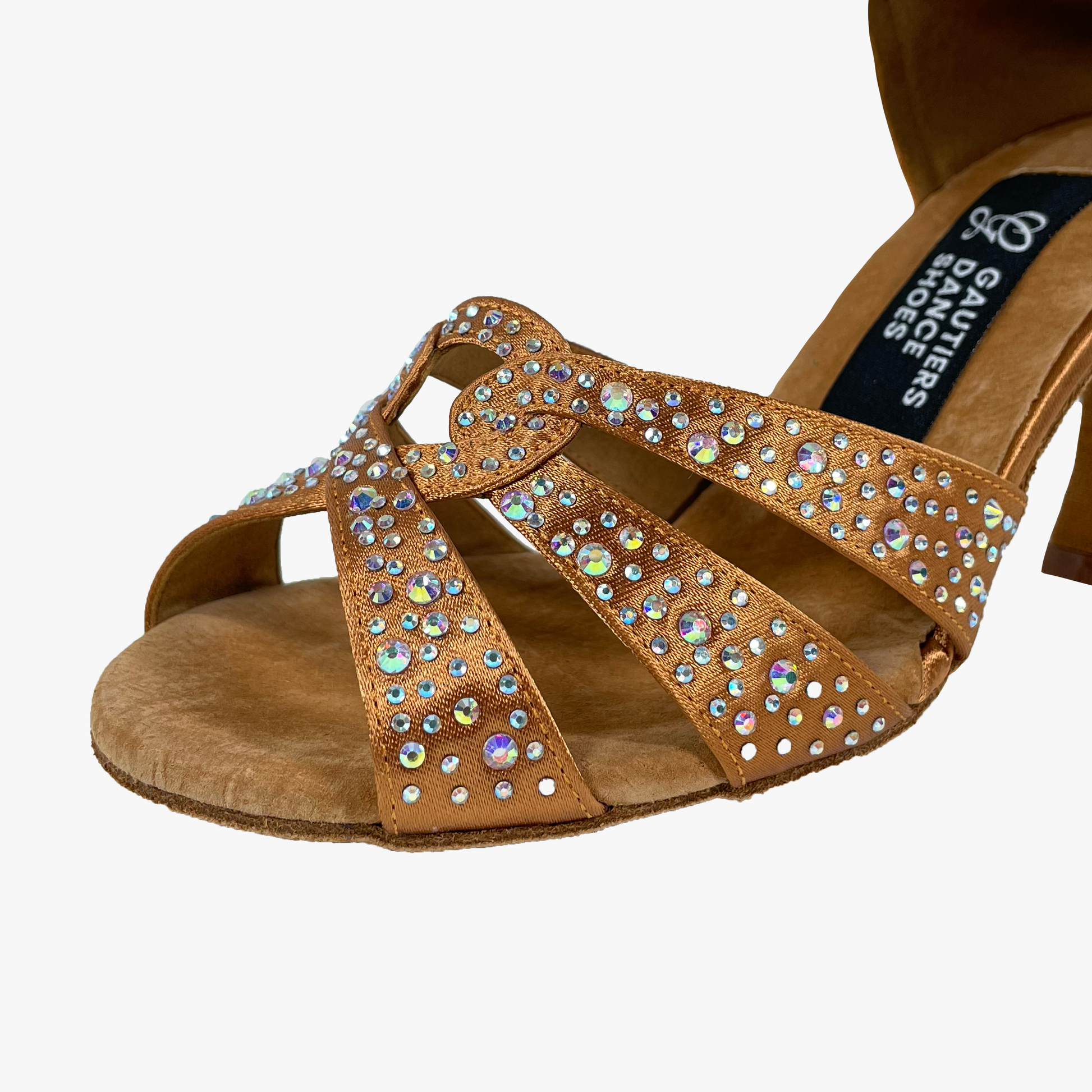 Latin dance shoe with suede sole and microfiber insole for maximum comfort. Designed in a strappy style ending in a central link. Decorated with hotfix rhinestones in bronze color.