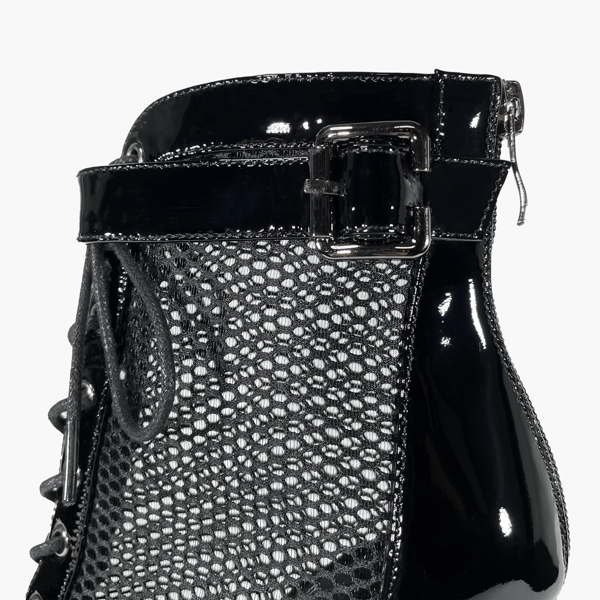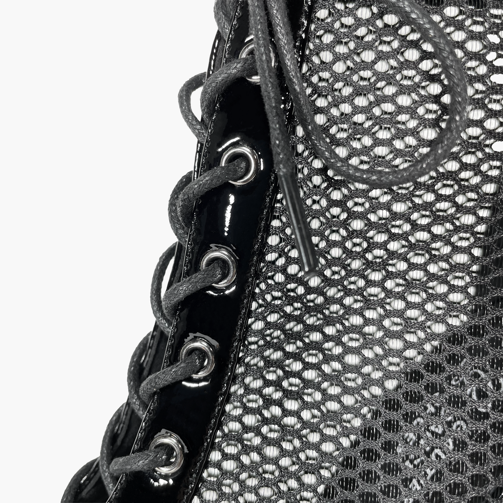 Diseño en AUTÉNTICA PIEL, color negro, acabado charol, redecilla en combinación con el zapato y también red transparente en la parte interior para que no pierda su forma y te dé una sujeción increíble. Punta cerradita y cordones delanteros asegurando así un ajuste perfecto en cualquier tipo de pies (anchos o estrechos). Banda superior con hebilla lateral lo que aporta un toque diferente y actual.