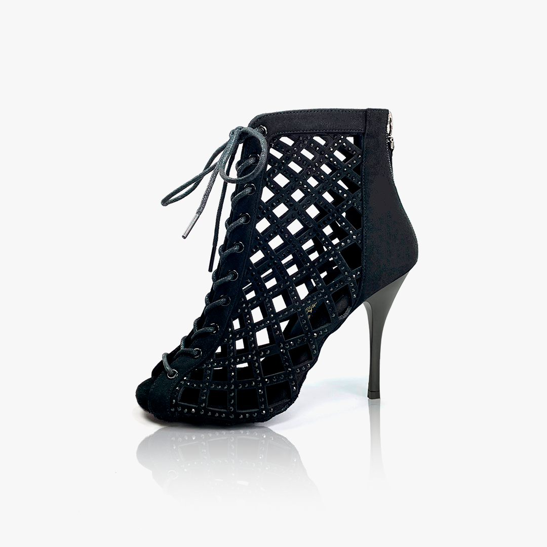 Diseño en forma de malla en rombos con cremallera trasera. Completamente acordonado delante, incluso la punta, asegurando así un ajuste perfecto en cualquier tipo de pies (anchos o estrechos). Decorados con pequeños cristales negros para aportar un brillo sutil.