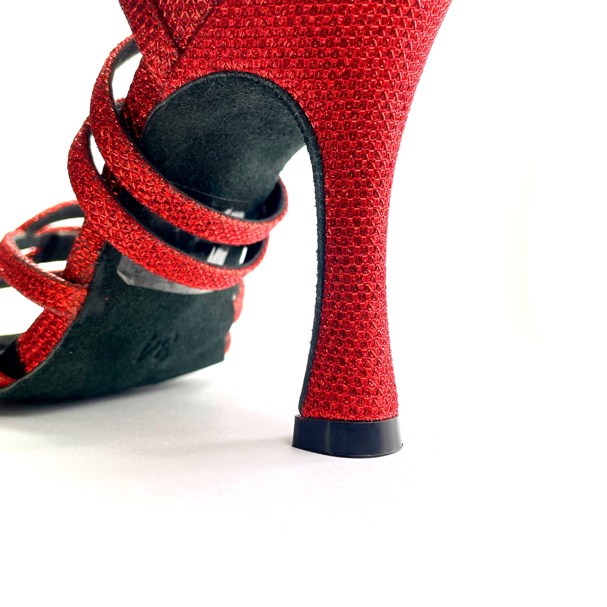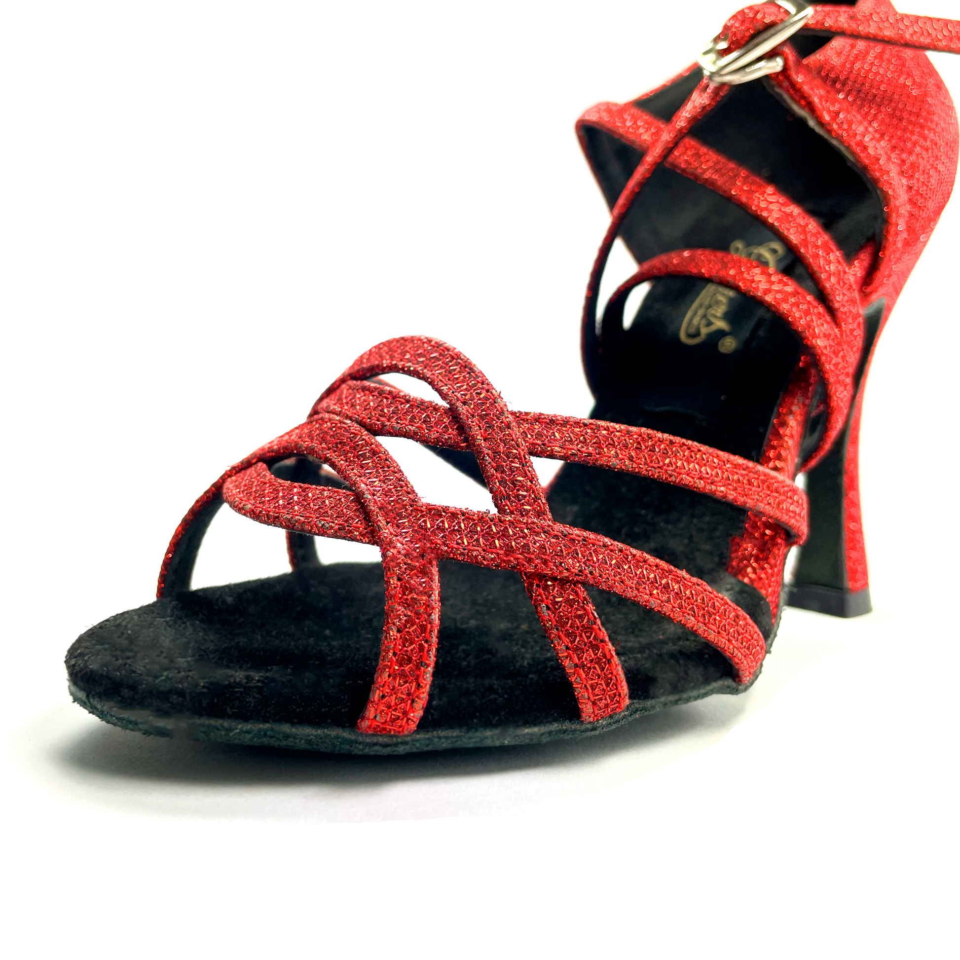 Zapato de baile latino en glitter brillante rojo, con suela de serraje. Plantilla con inserción de gel y suave forro interior de microfibra para una mayor comodidad. Diseñado con un estilo clásico de tiras cruzadas.