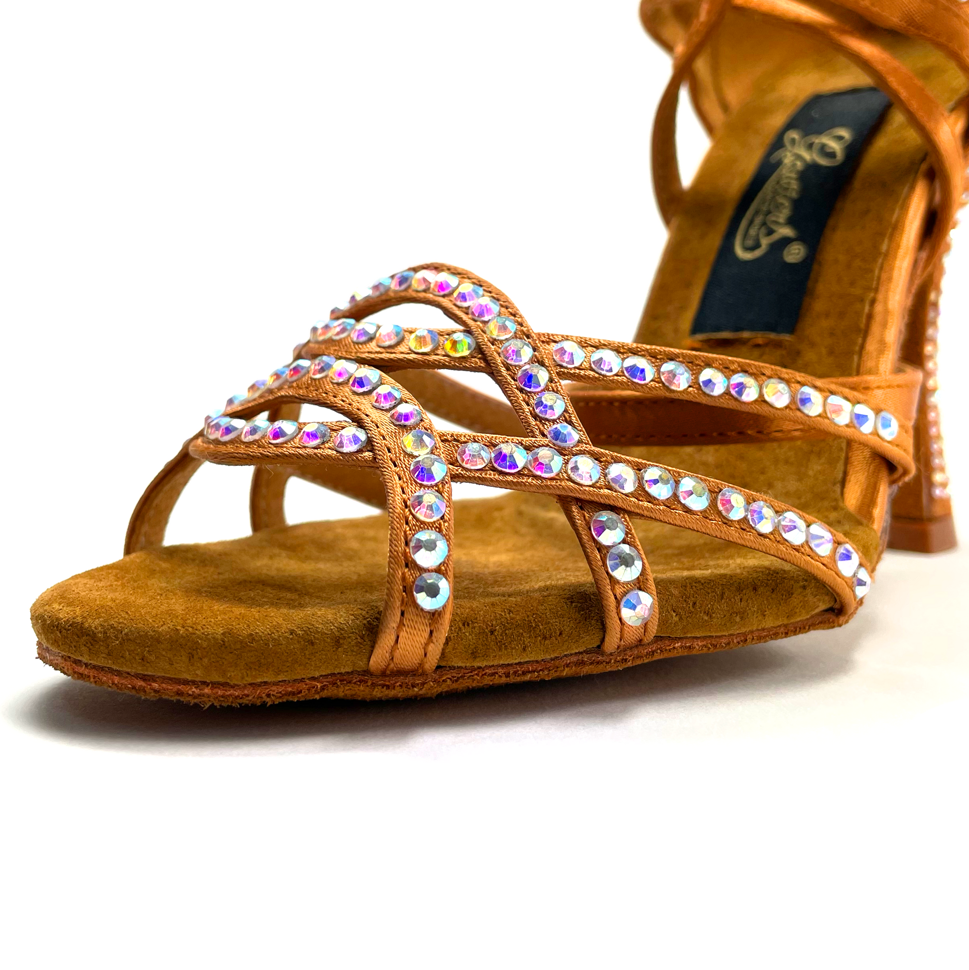 Zapato de baile latino con suela de serraje. Plantilla con inserción de gel y suave forro interior de microfibra para una mayor comodidad. Diseñado con un estilo de tiras cruzadas en color bronce y decorado con pedrería hotfix aurora boreal.