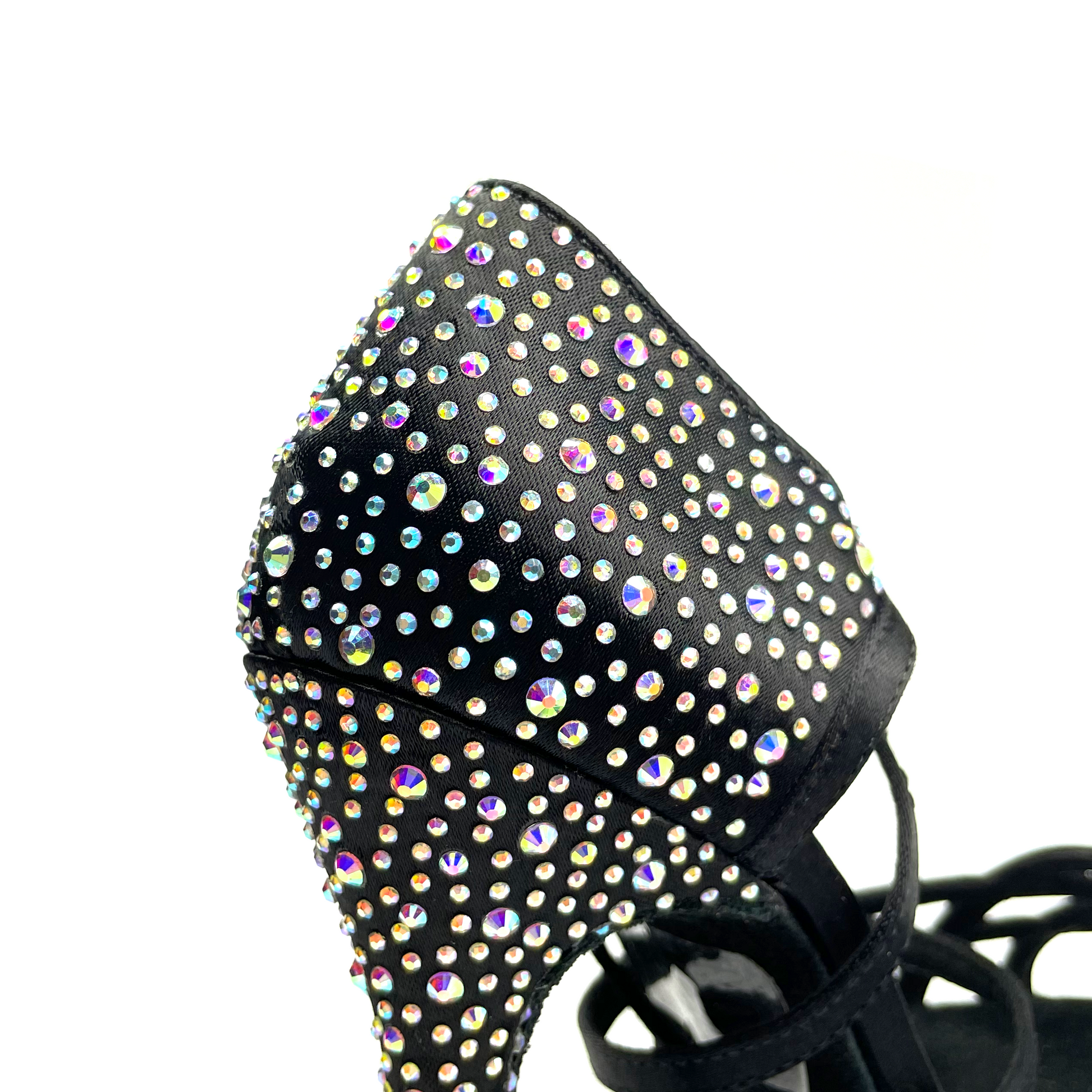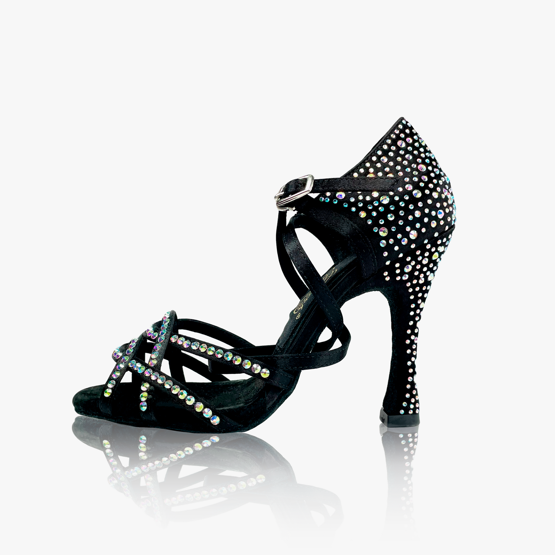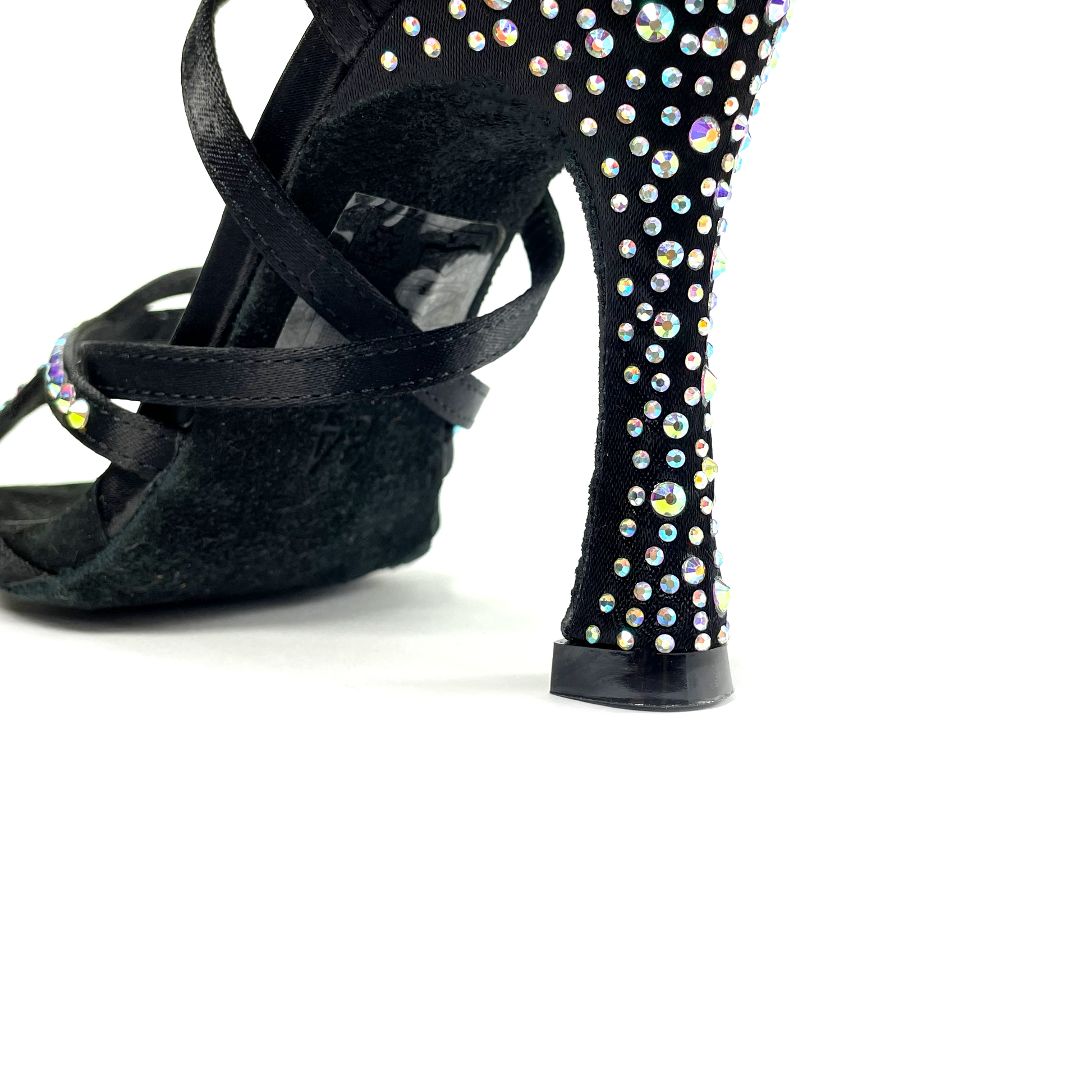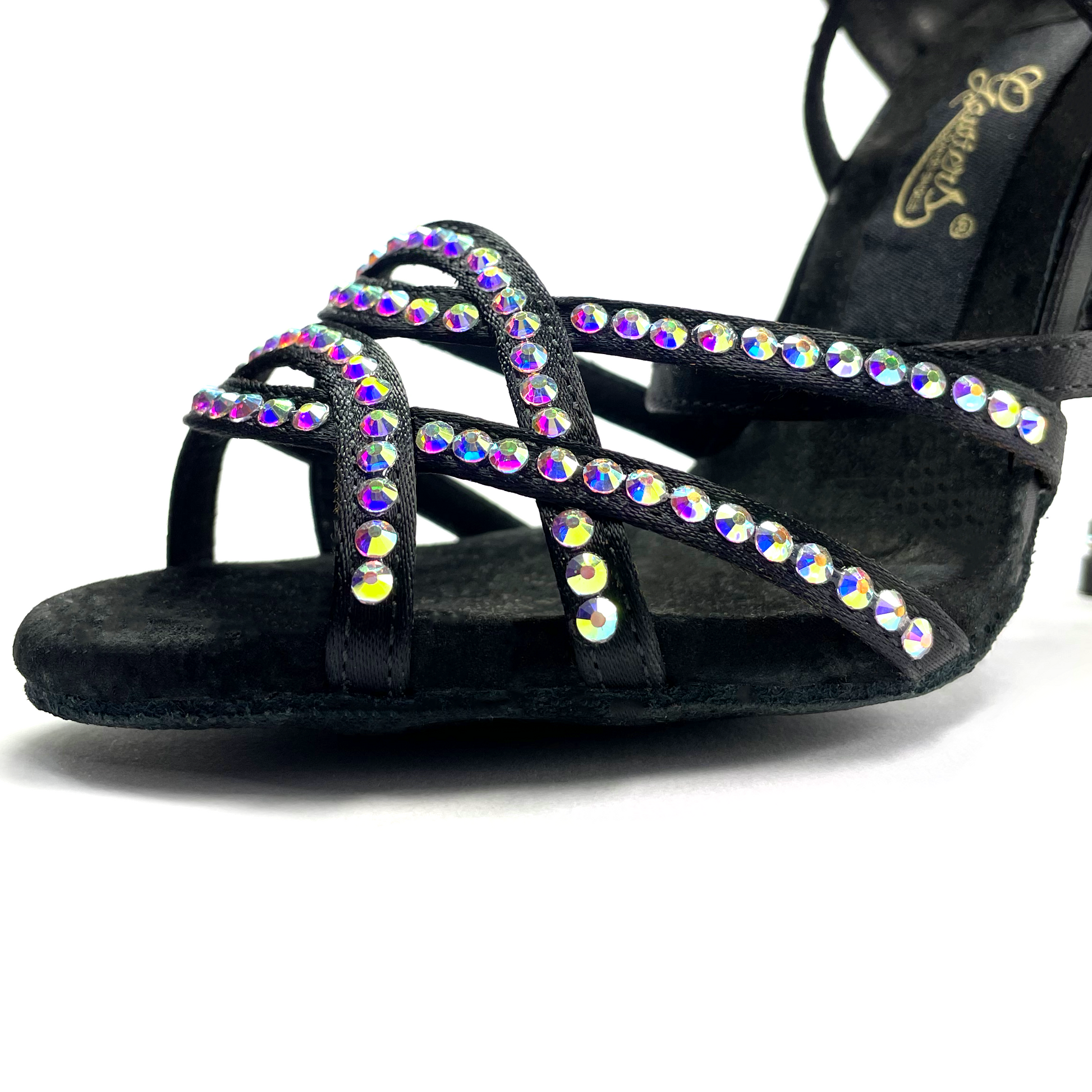 Zapato de baile latino con suela de serraje. Plantilla con inserción de gel y suave forro interior de microfibra para una mayor comodidad. Diseñado con un estilo de tiras cruzadas en color negro y decorado con pedrería hotfix aurora boreal.