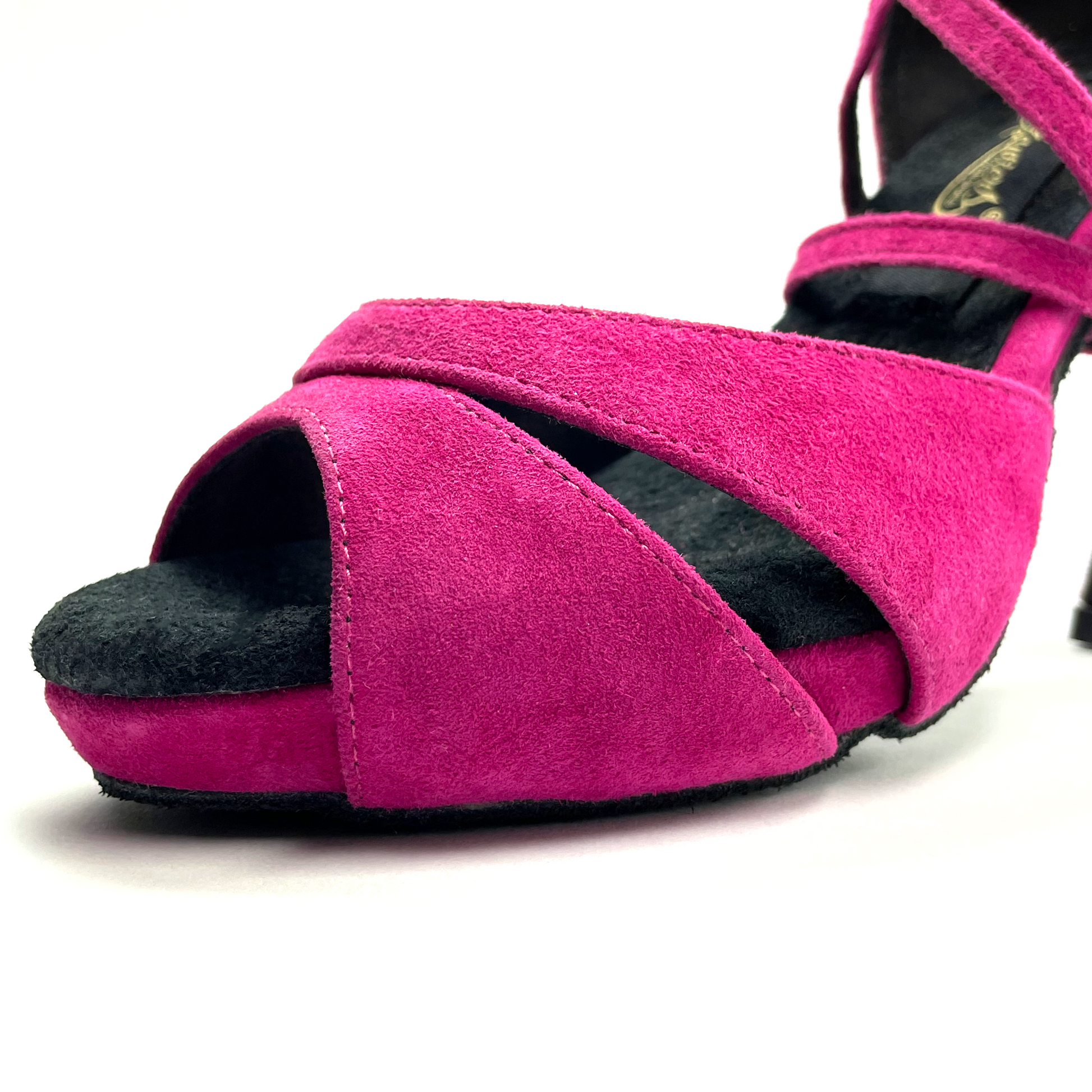 Zapato de baile latino de ante con suela de serraje. Plantilla con inserción de gel y suave forro interior de microfibra para una mayor comodidad. Diseñado con un estilo de dos tiras anchas en color rosa para un mejor agarre al pie.
