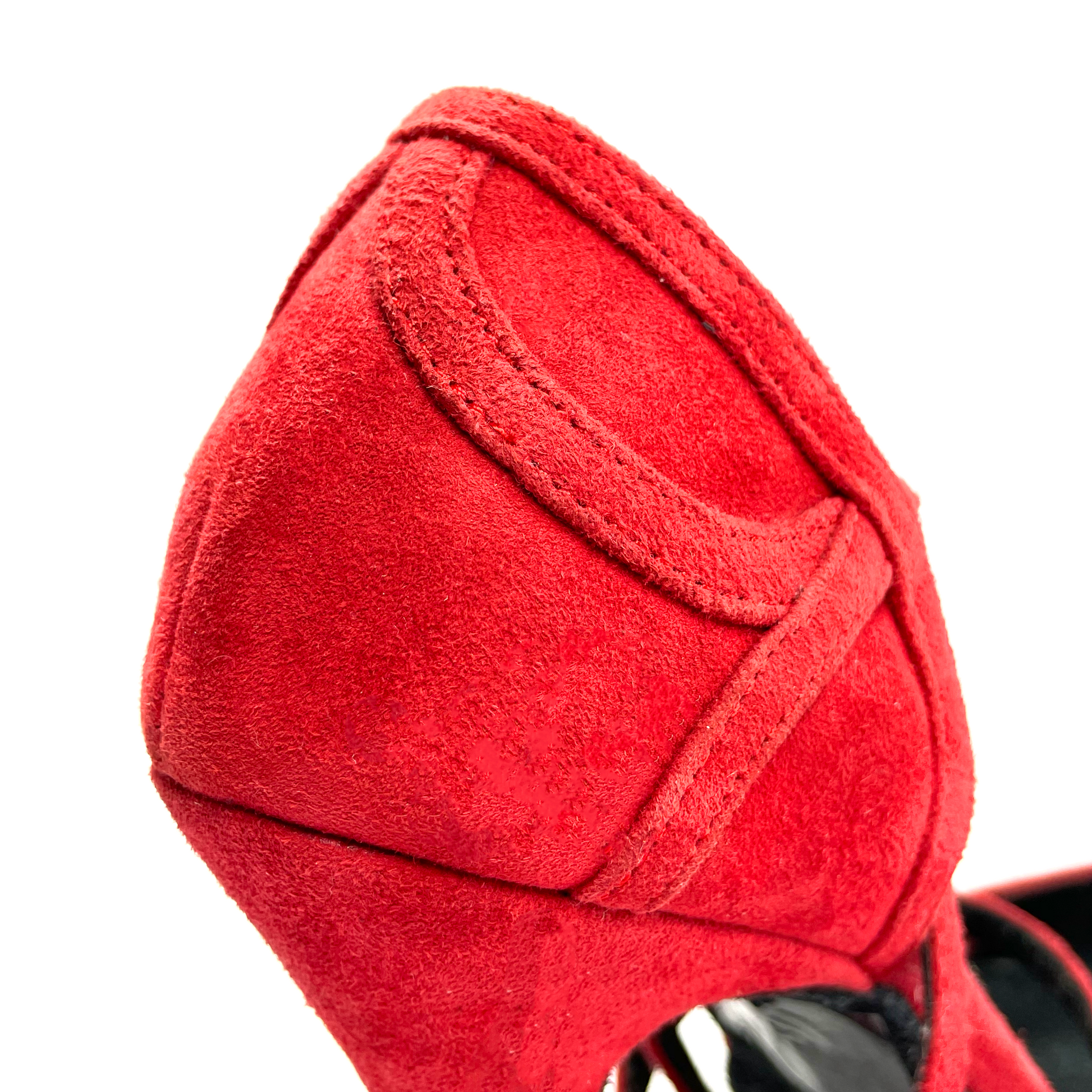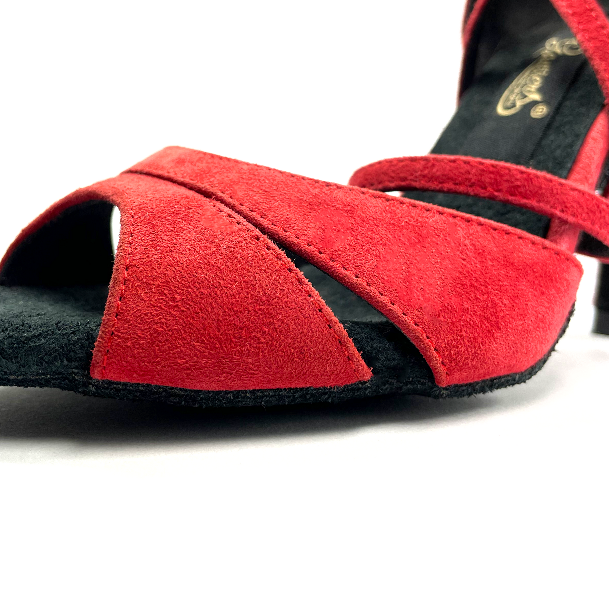 Zapato de baile latino de ante con suela de serraje. Plantilla con inserción de gel y suave forro interior de microfibra para una mayor comodidad. Diseñado con un estilo de dos tiras anchas en color vino para un mejor agarre al pie.