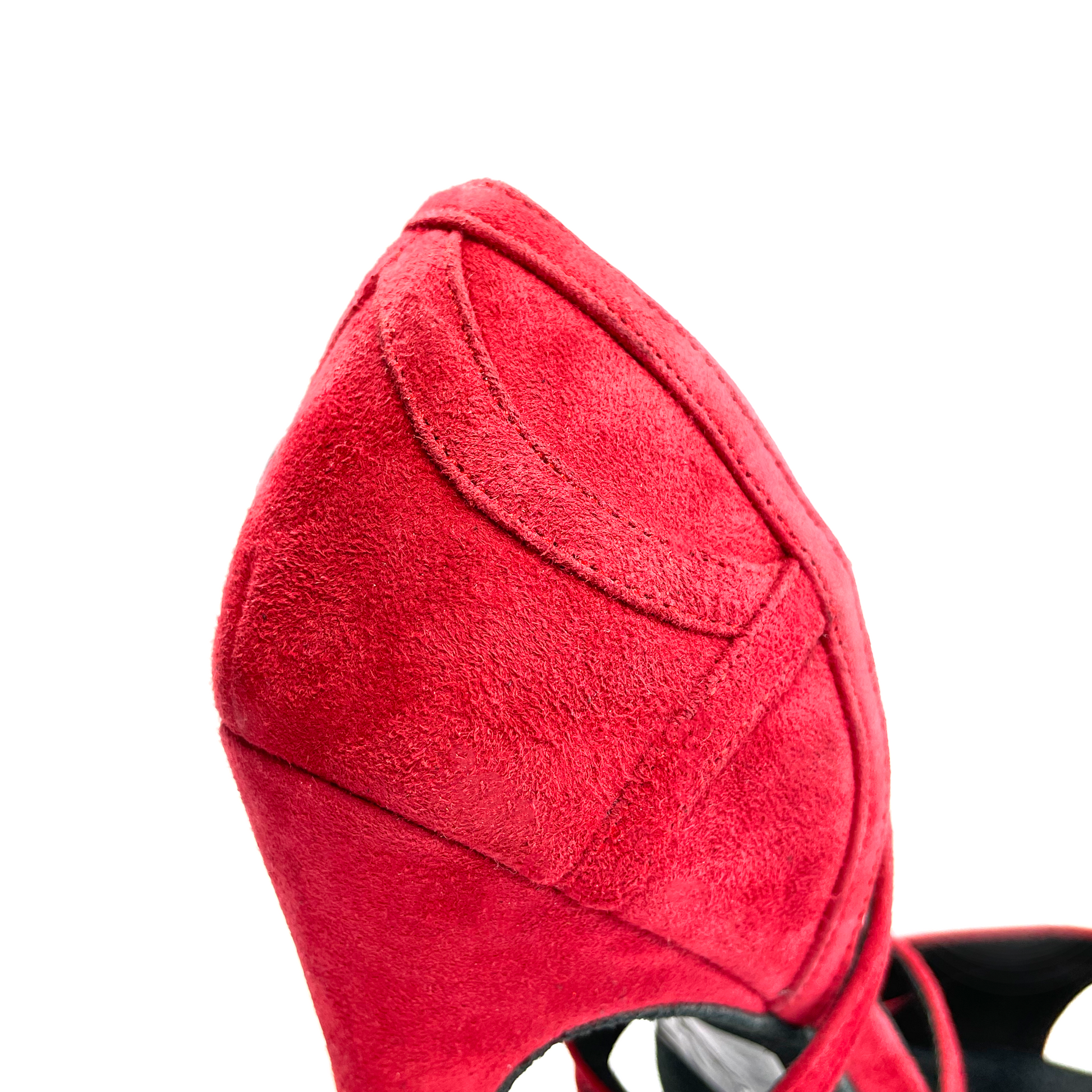 Zapato de baile latino de ante con suela de serraje. Plantilla con inserción de gel y suave forro interior de microfibra para una mayor comodidad. Diseñado con un estilo de dos tiras anchas en color vino para un mejor agarre al pie.