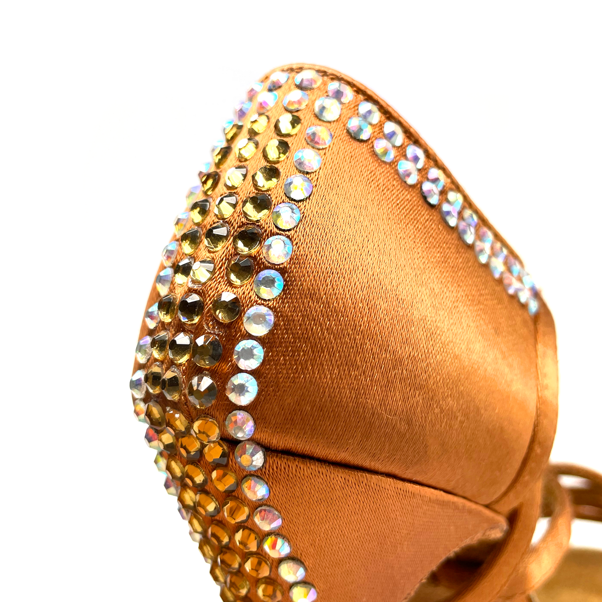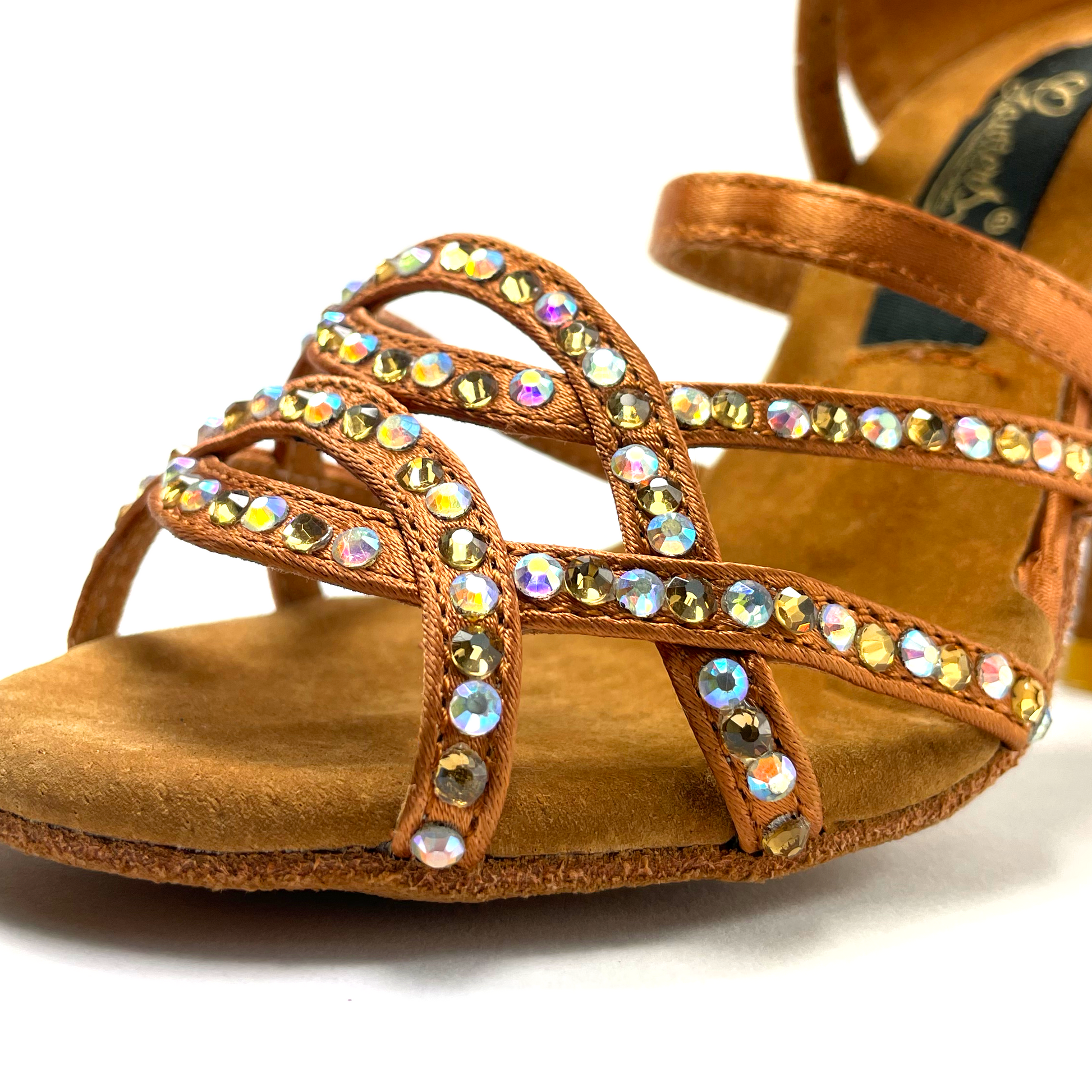 Zapato de baile latino con suela de serraje. Plantilla con inserción de gel y suave forro interior de microfibra para una mayor comodidad. Diseñado con un estilo de tiras cruzadas en color bronce y decorado con pedrería hotfix color aurora boreal.