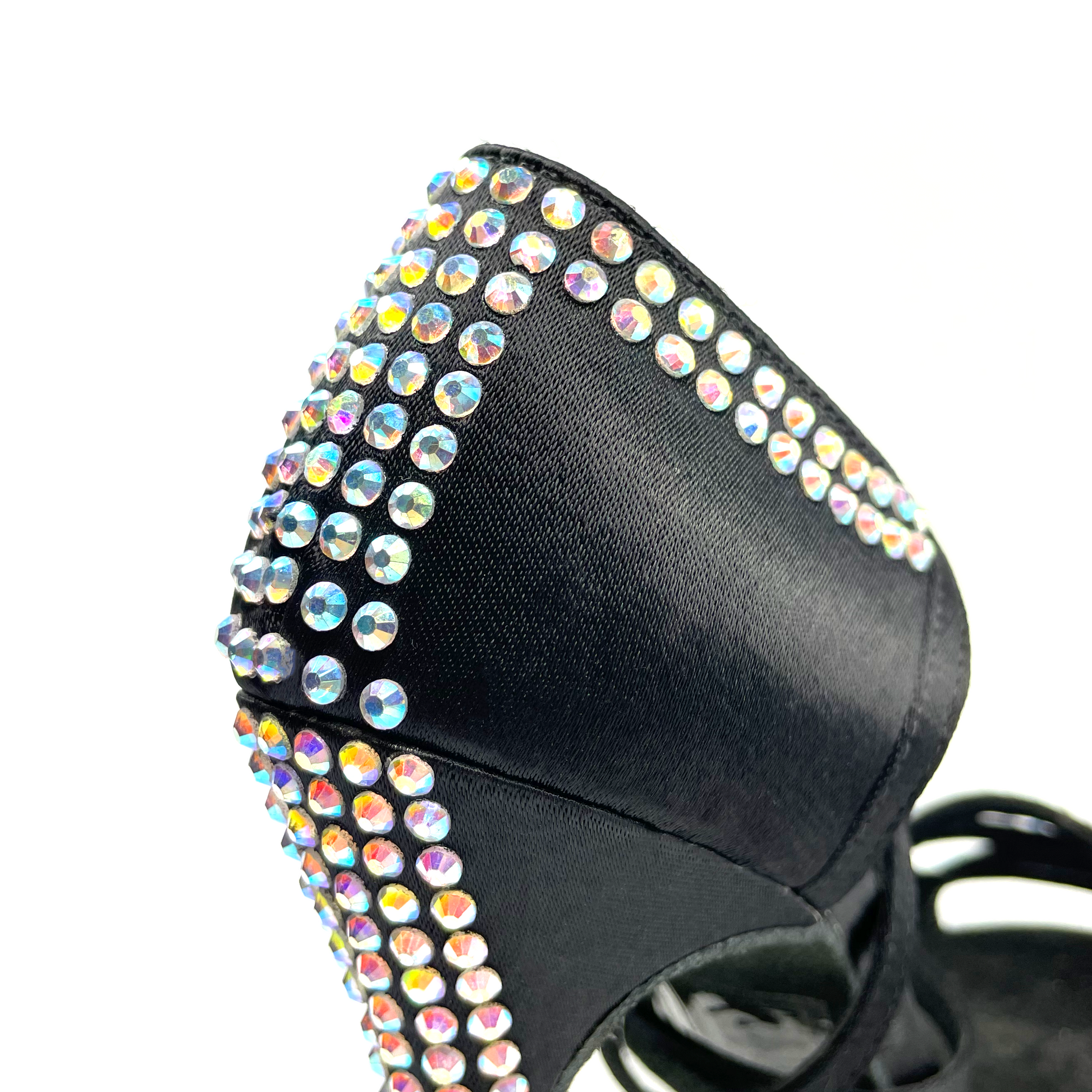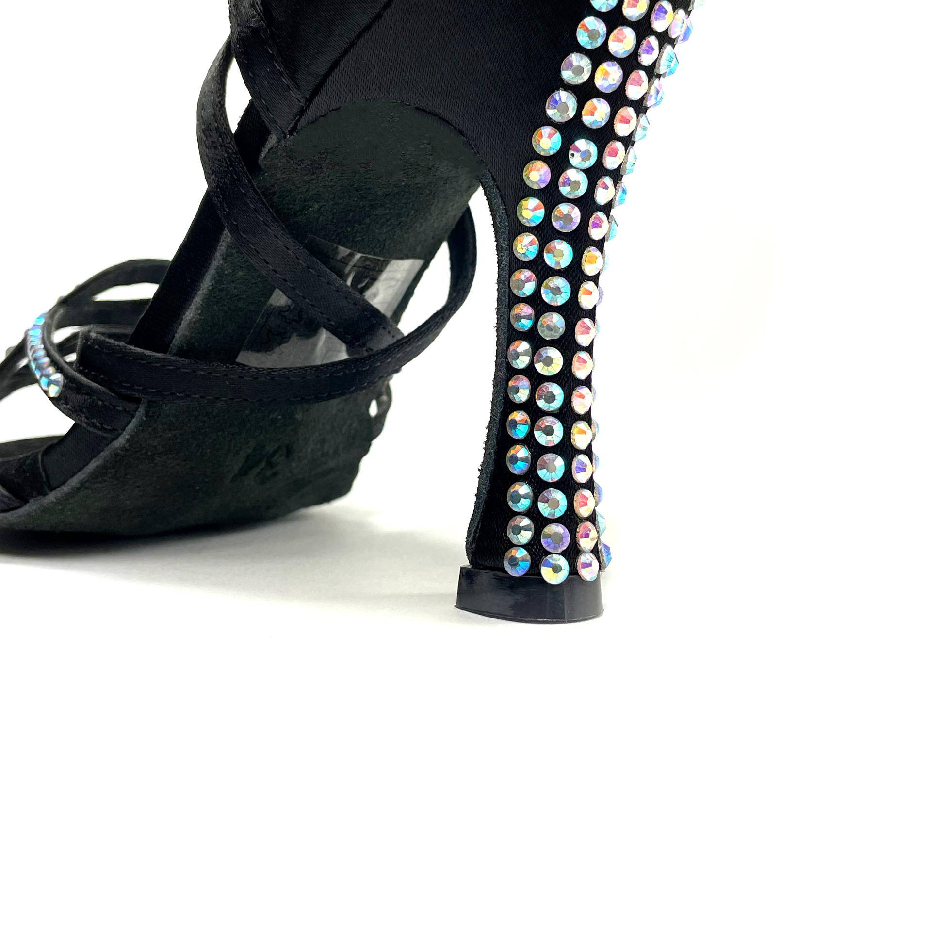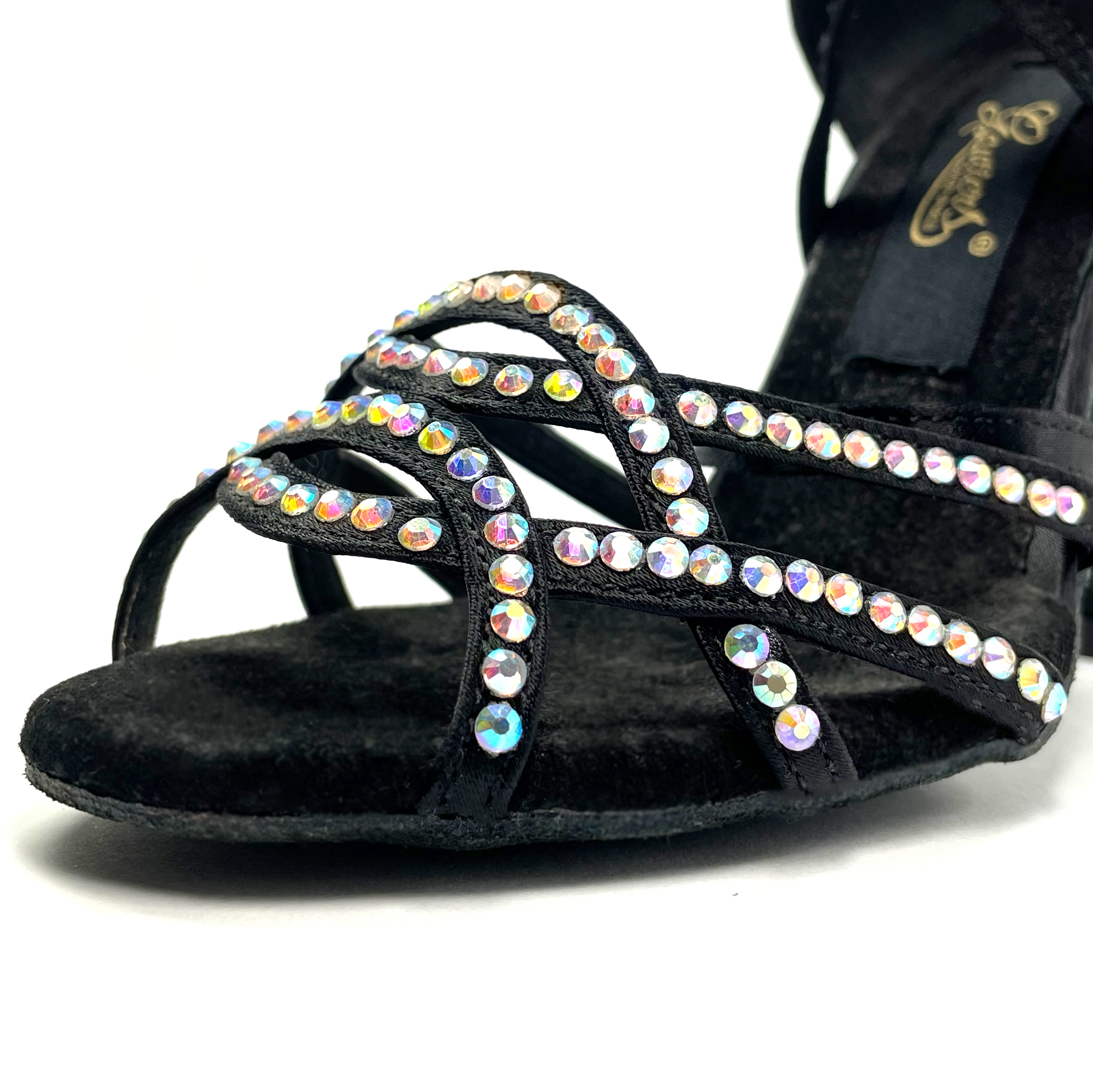 Zapato de baile latino con suela de serraje. Plantilla con inserción de gel y suave forro interior de microfibra para una mayor comodidad. Diseñado con un estilo de tiras cruzadas en color negro y decorado con pedrería hotfix color aurora boreal.