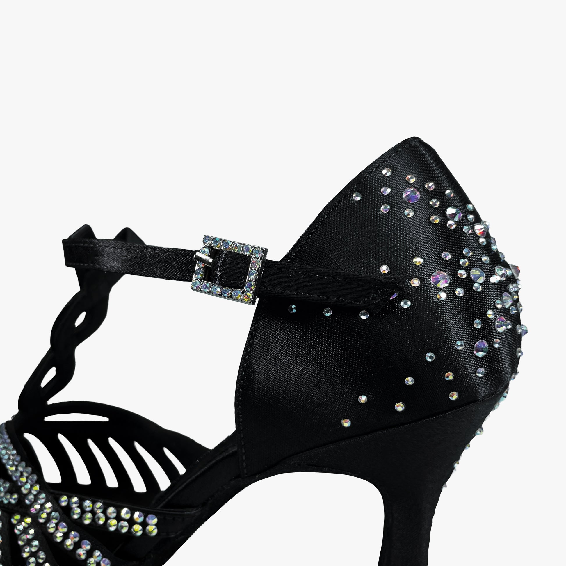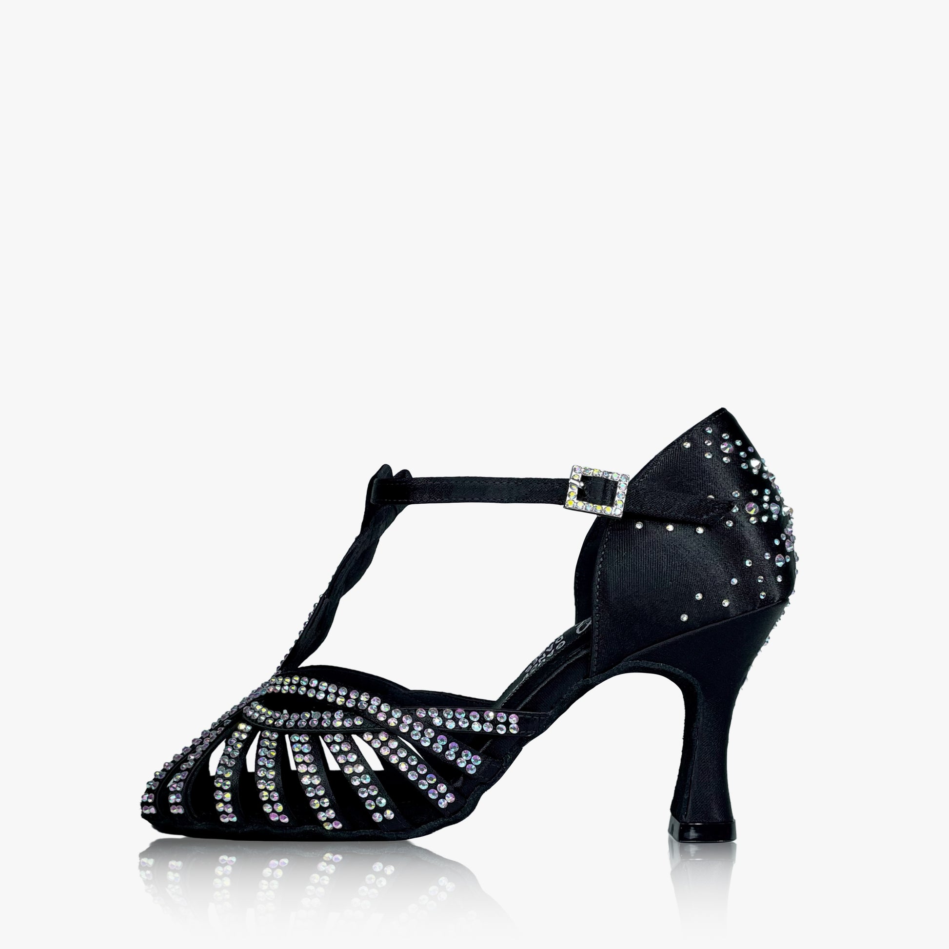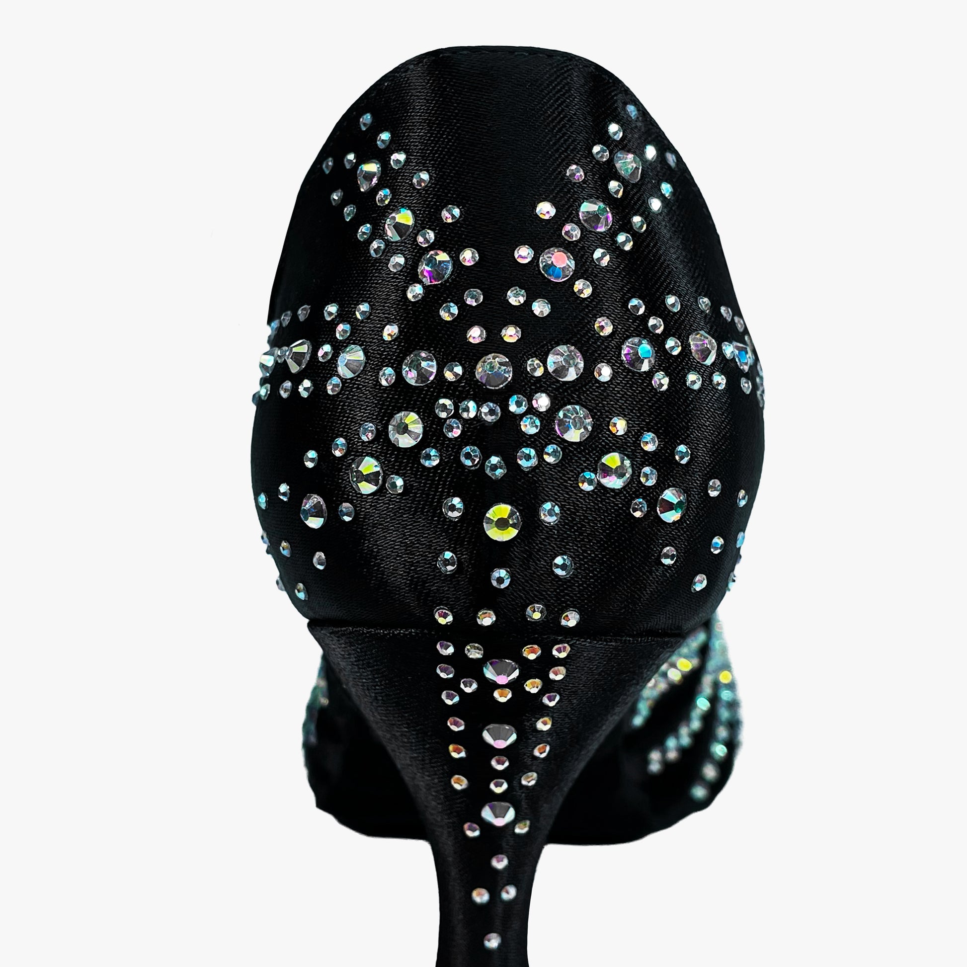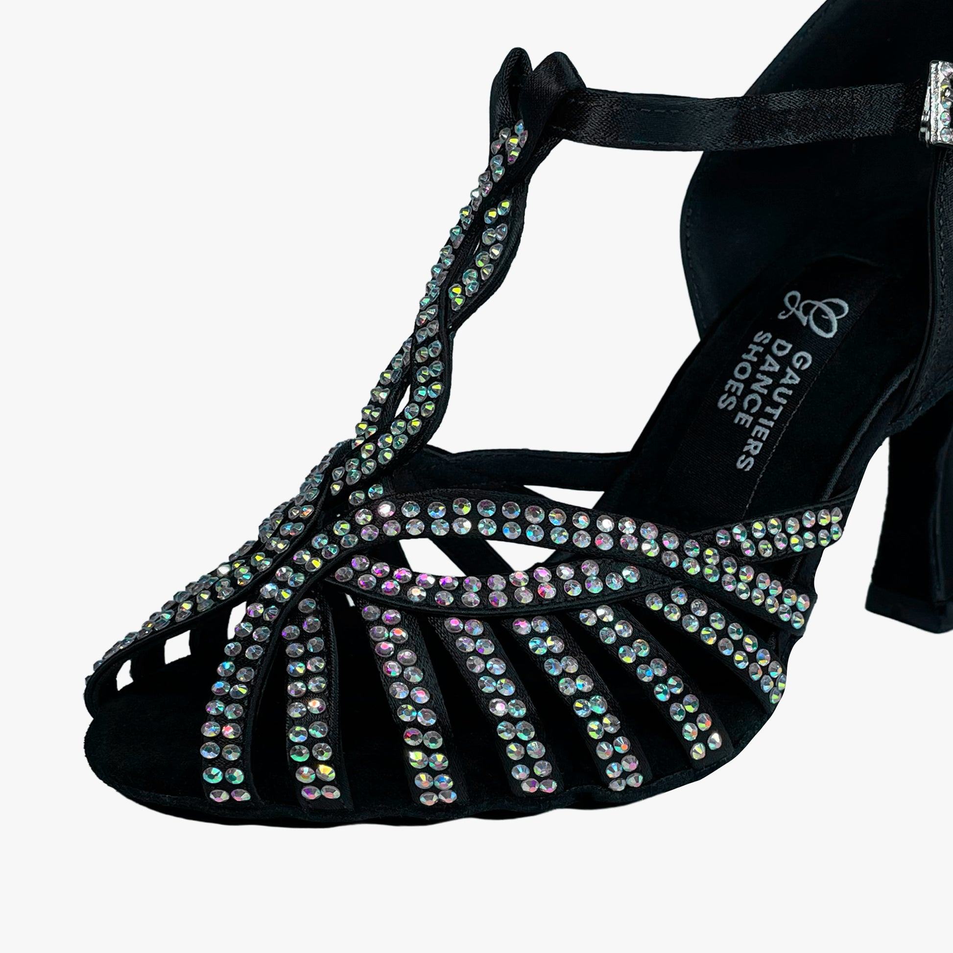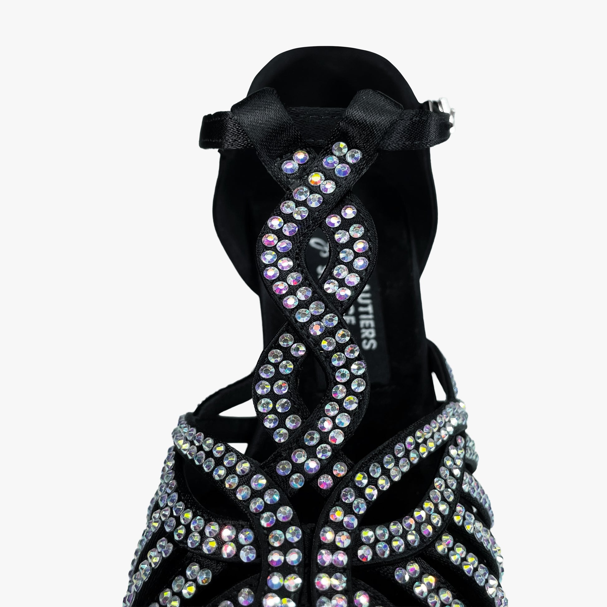 Zapato de baile confeccionado en satén negro de alta gama con suela de serraje. Diseñado con numerosas tiras muy juntitas y punta mas cerrada para ofrecer un mayor agarre y evitar que se salgan los deditos en los laterales y en la parte delantera. Trenza en el empeine para realzar su elegante diseño. Decorado con cristales color aurora boreal de alto brillo en la parte delantera y trasera que lo hace una auténtica joya que atraerá todas las miradas.