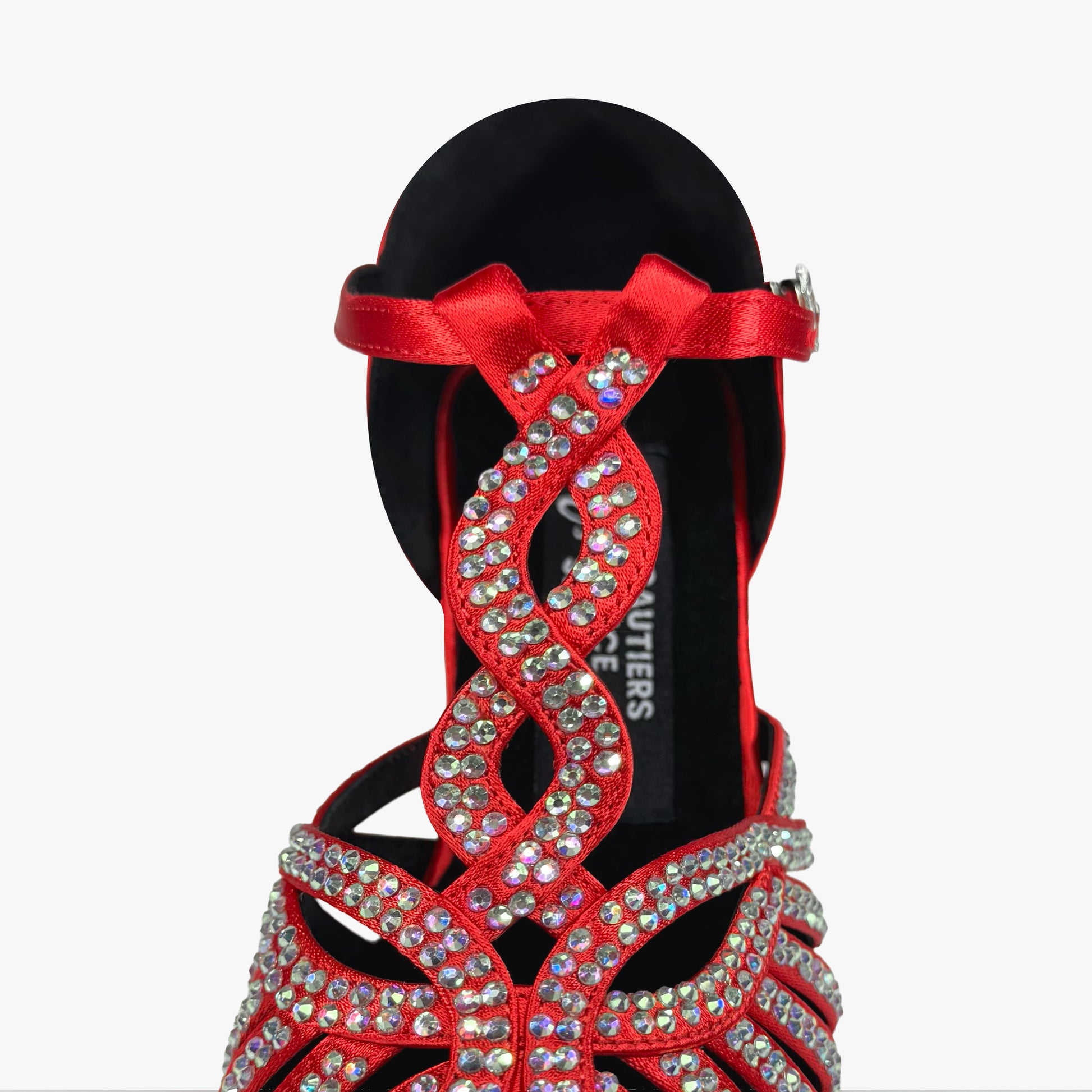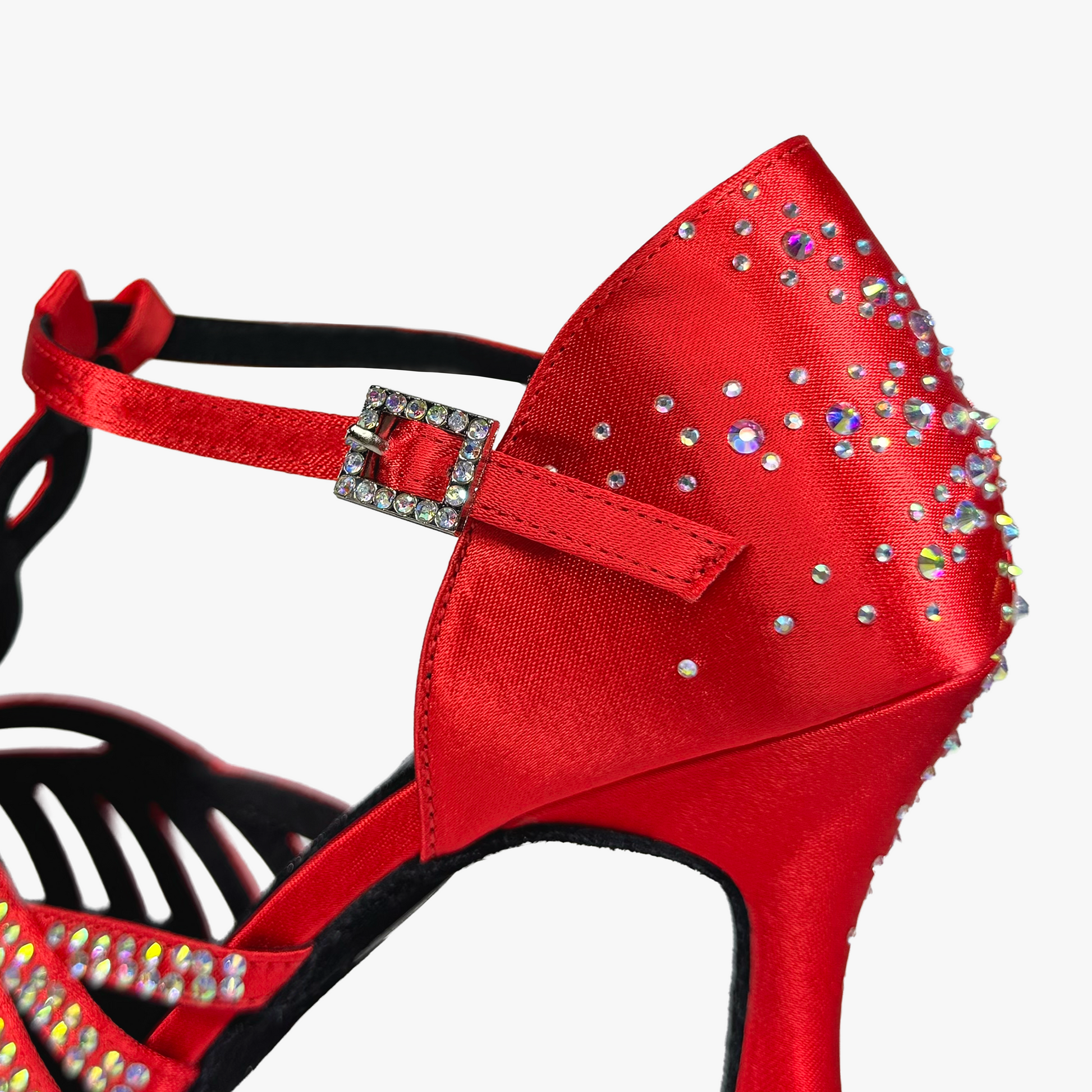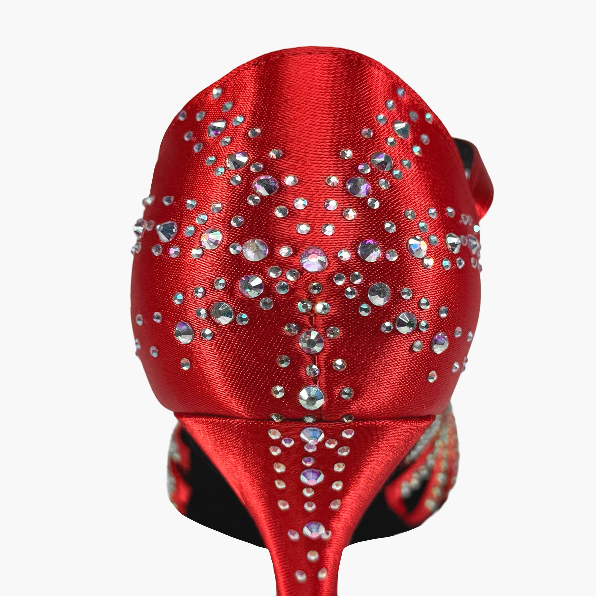 Zapato de baile confeccionado en satén rojo de alta gama con suela de serraje. Diseñado con numerosas tiras muy juntitas y punta mas cerrada para ofrecer un mayor agarre y evitar que se salgan los deditos en los laterales y en la parte delantera. Trenza en el empeine para realzar su elegante diseño. Decorado con cristales color aurora boreal de alto brillo en la parte delantera y trasera que lo hace una auténtica joya que atraerá todas las miradas.