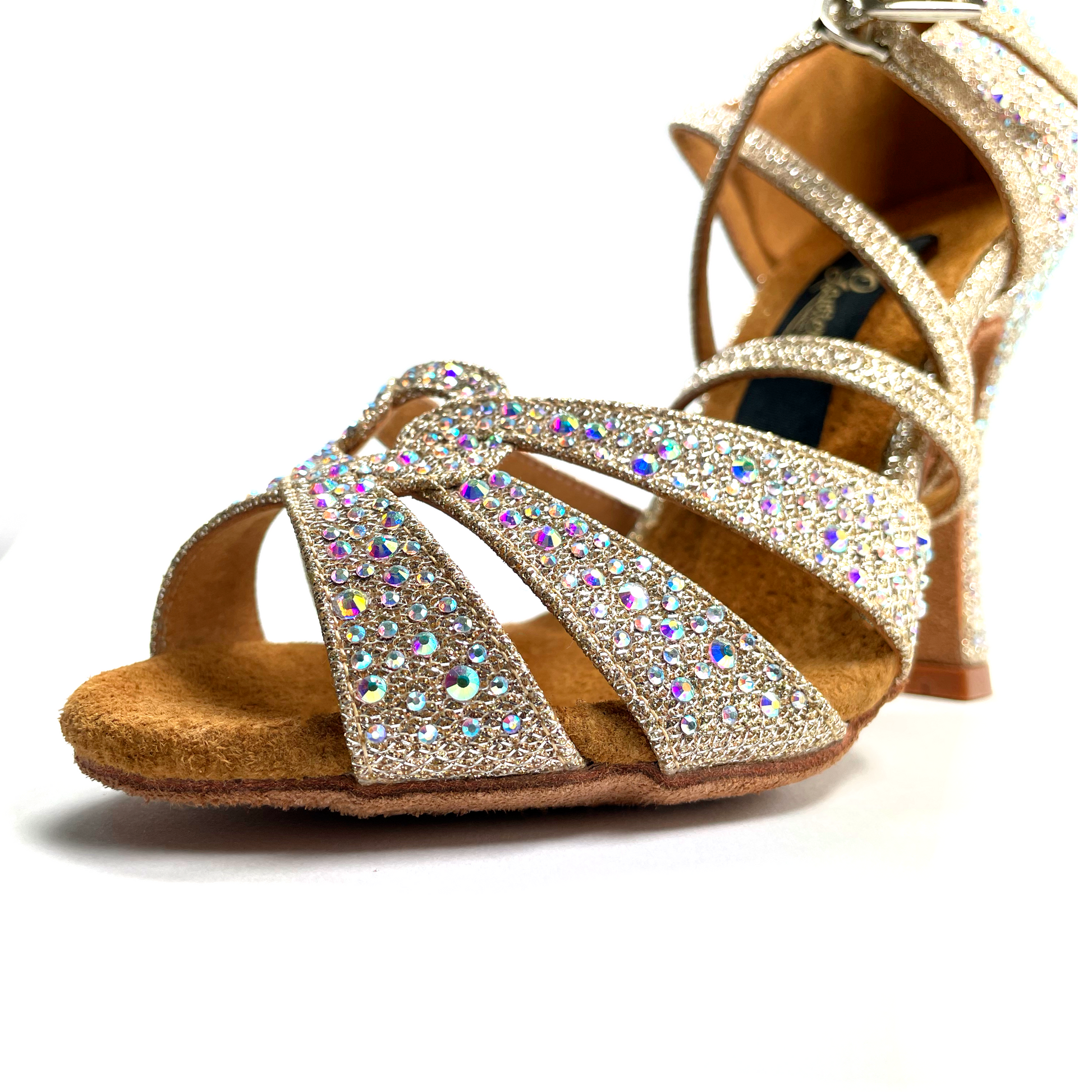 Zapato de baile confeccionado en satén glitter dorado, con laterales delanteros semi-cerrados con un diseño elegante. Tira para cruzar en el empeine para un mejor ajuste y broche de brillantes. Decorado con cristales color aurora boreal de alto brillo, ofreciendo destellos espectaculares.