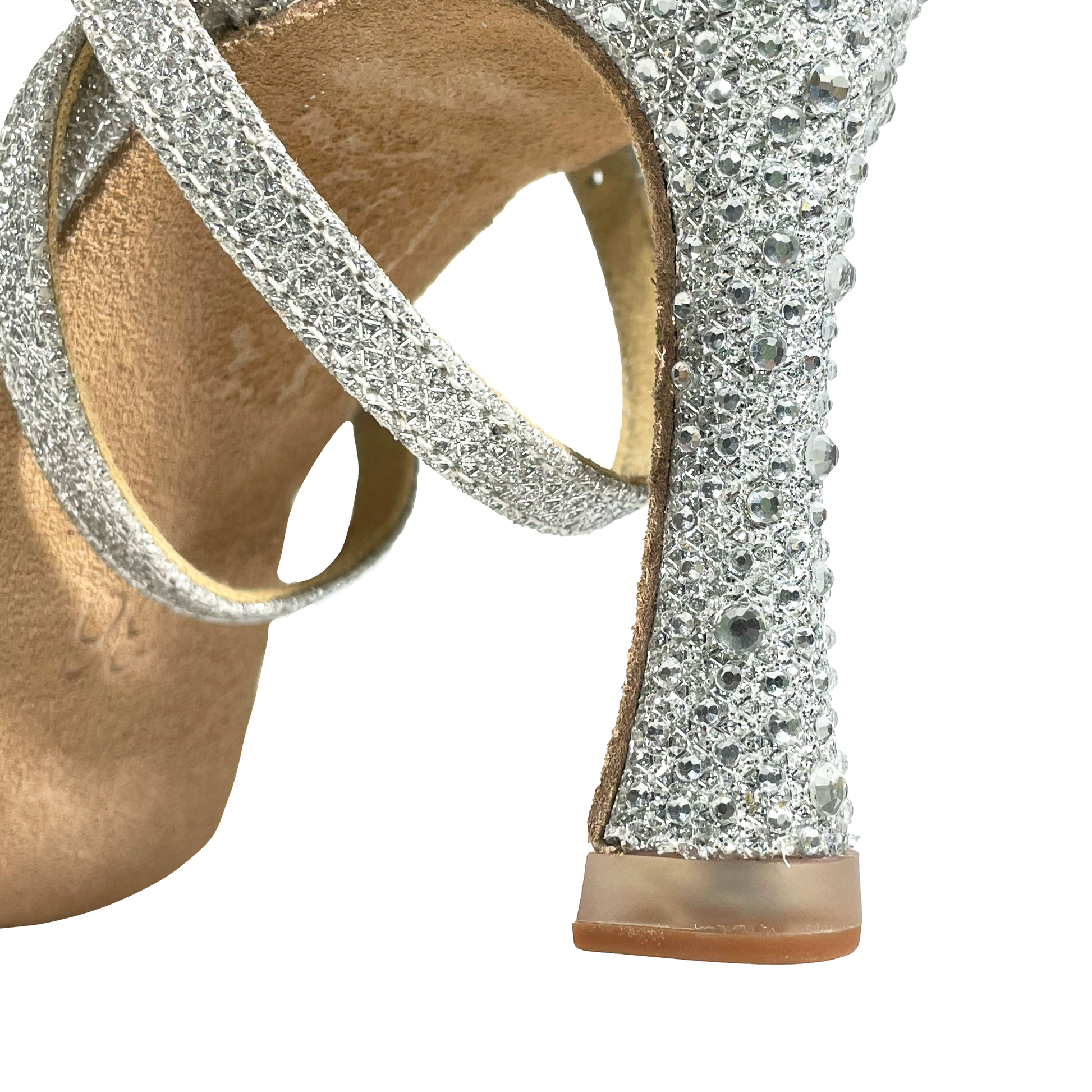 Zapato de baile elegante y lujoso que roba miradas, combina glitter y malla para un diseño muy atractivo. Diseño cerradito en la parte delantera para mayor agarre del pie y si tienes el pie estrecho, evitar que se te salgan los deditos por delante. Decorado con pedrería hotfix de alto brillo en color cristal lo que aporta un brillo espectacular.