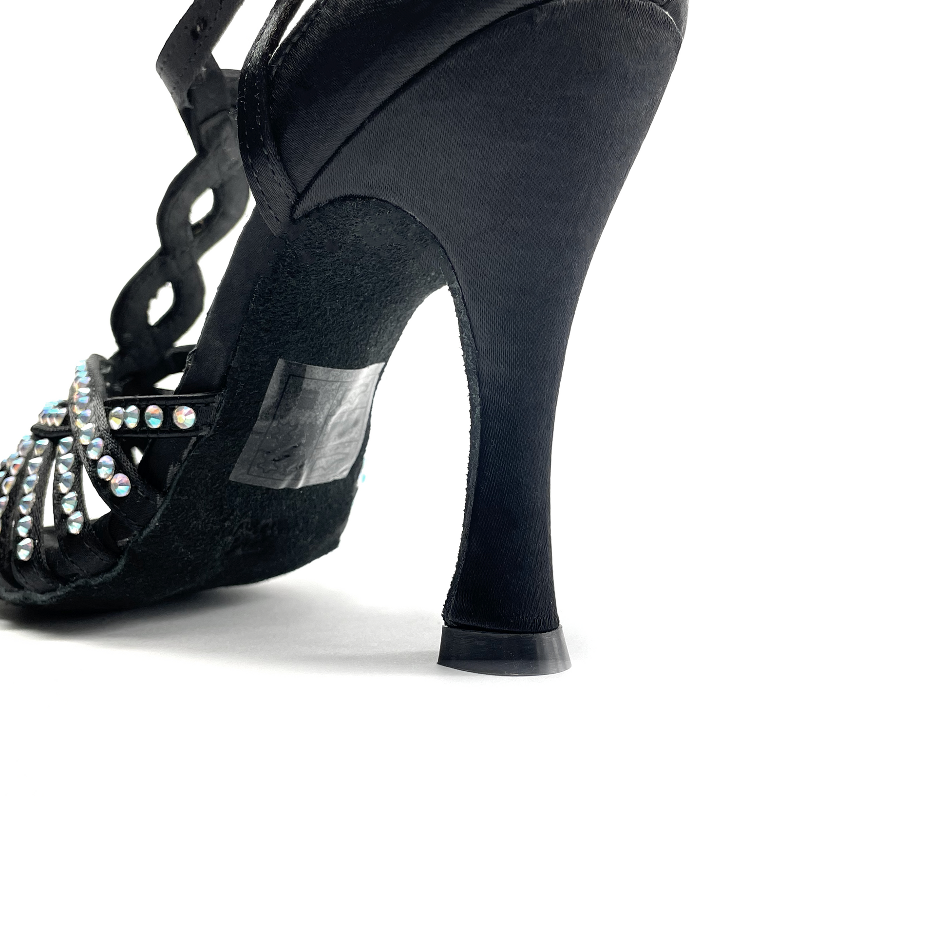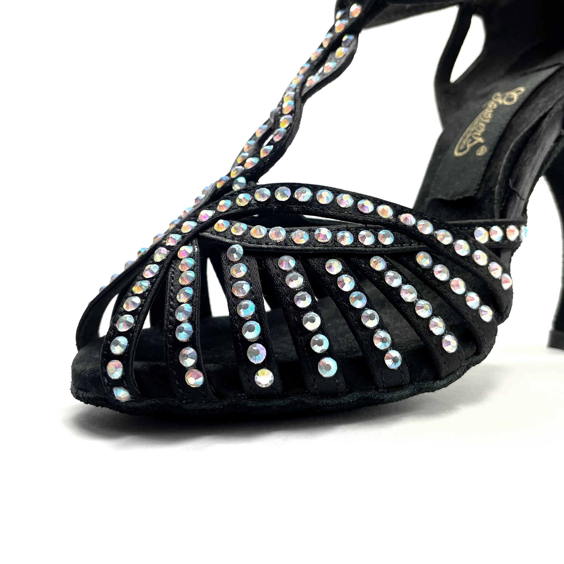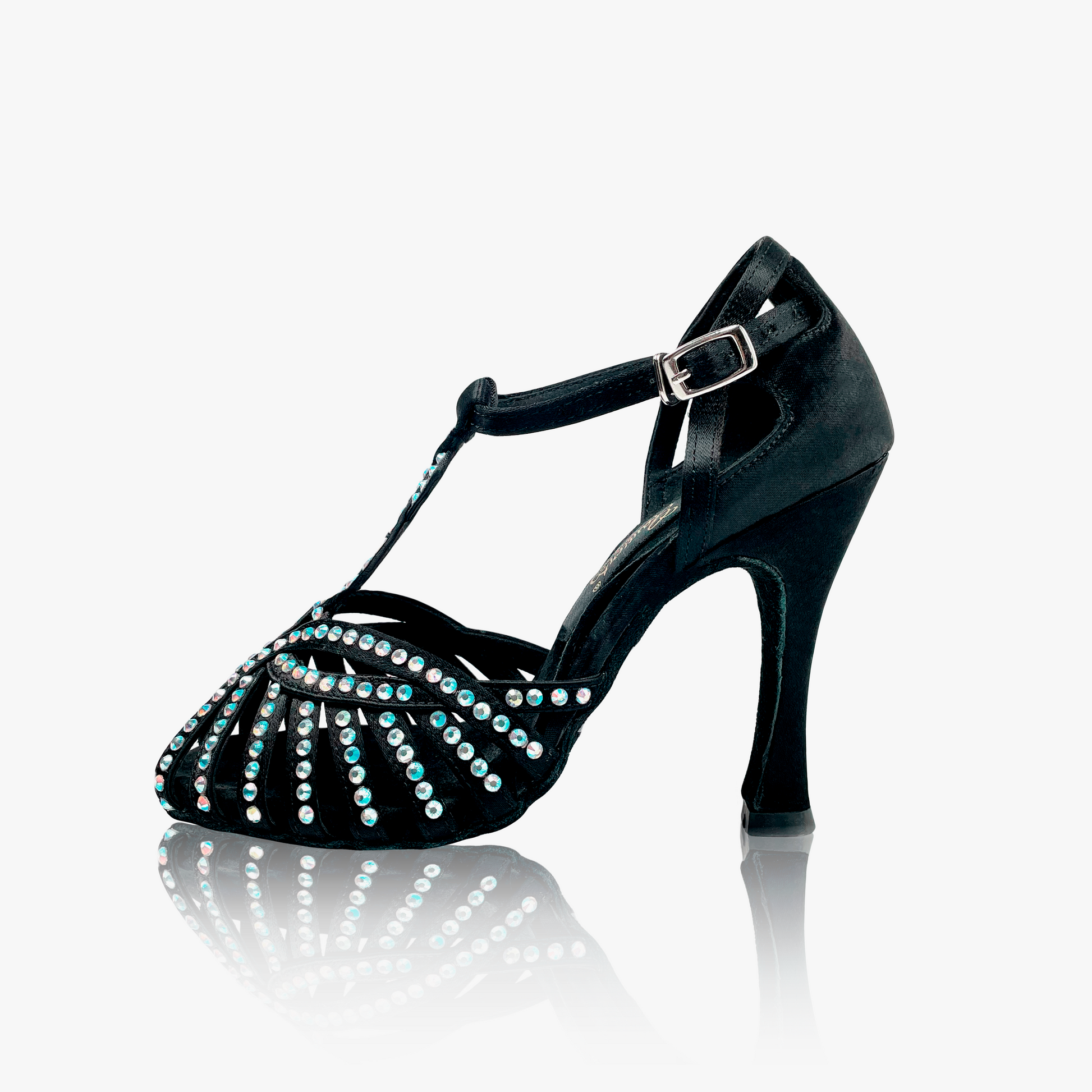 Zapato de baile latino con suela de serraje. Plantilla con inserción de gel y suave forro interior de microfibra para una mayor comodidad. Diseñado con un estilo más cerrado en la parte delantera, de tiras en color negro.